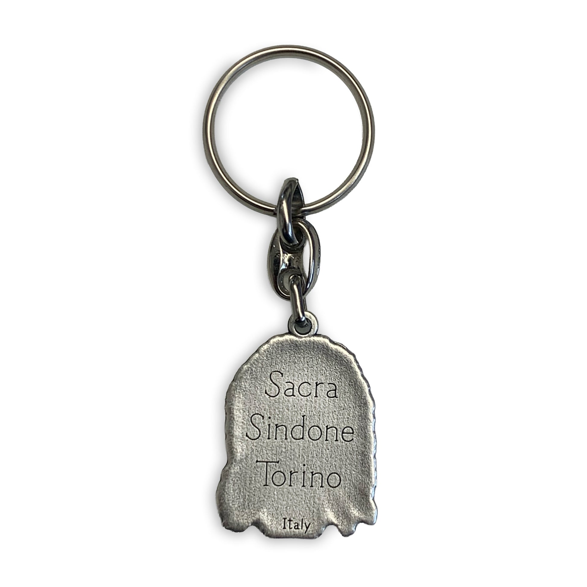 Un elegante portachiavi in metallo dedicato alla Sacra Sindone di Torino, con il volto di Cristo finemente scolpito sul fronte e l’incisione “Sacra Sindone Torino – Italy” sul retro.